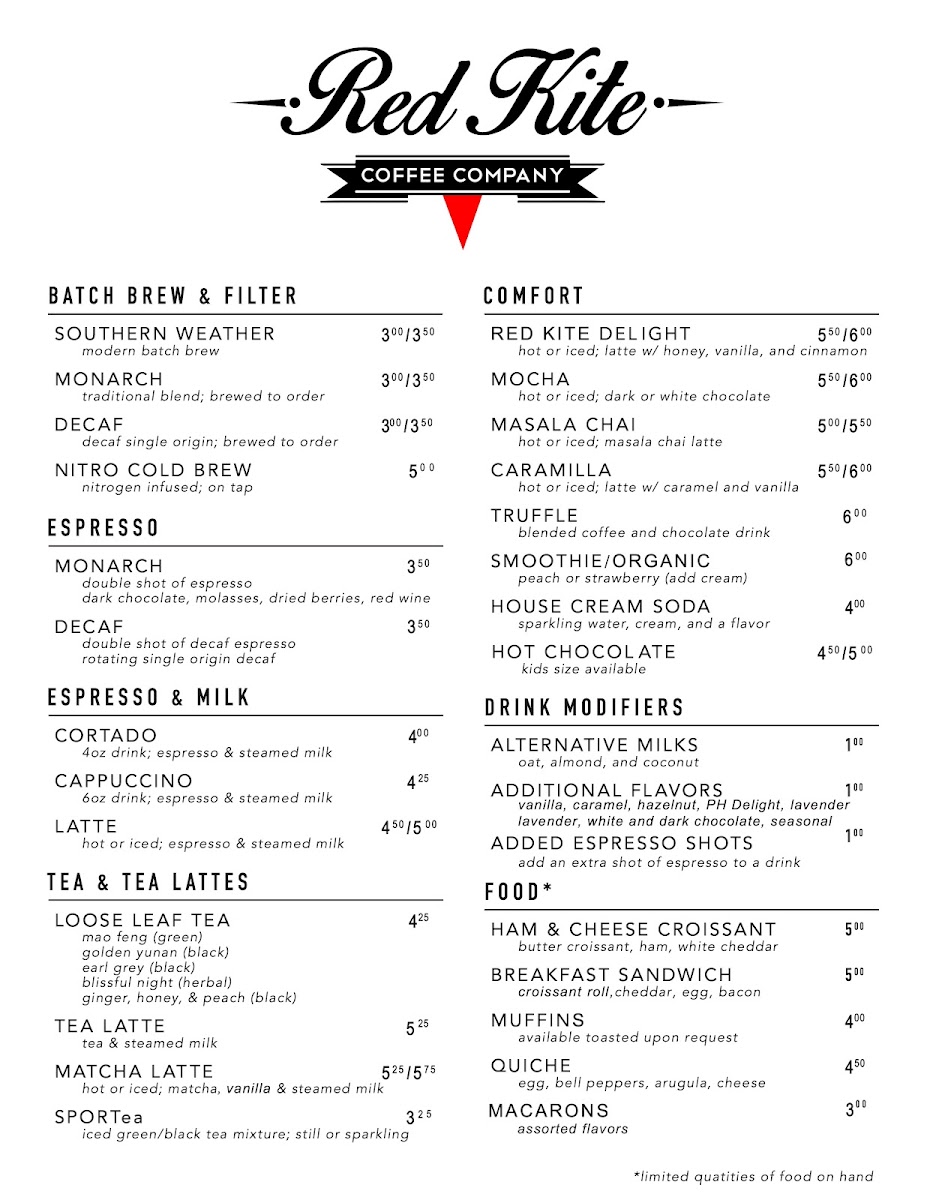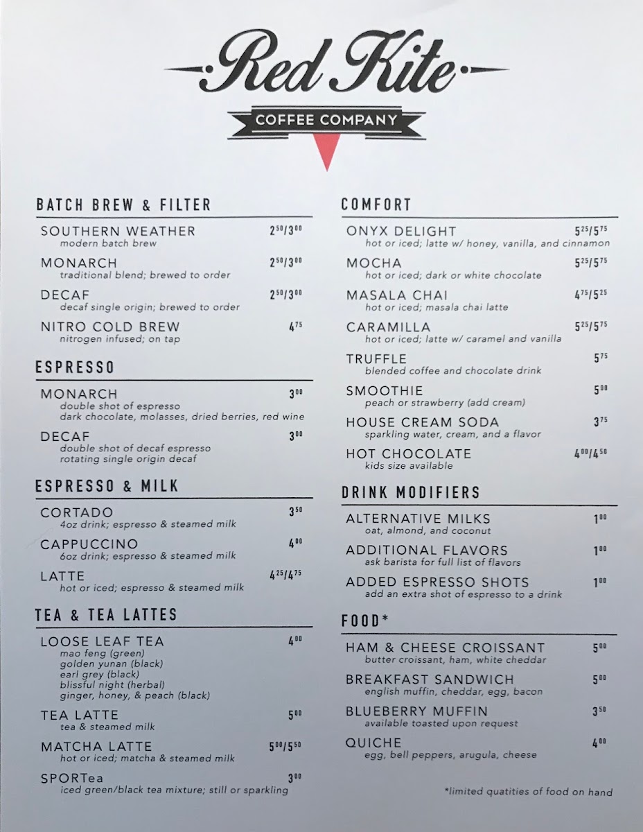 Nestled in the heart of Bentonville, the Red Kite Coffee Company Menu offers a cozy escape for coffee lovers and casual diners alike. Whether you're in the mood for a rich, hand-crafted espresso or a smooth cold brew, there's a perfect pick waiting for you. The menu features an array of freshly brewed coffee options, each carefully selected to provide a delightful balance of flavor and aroma. For those who prefer a bite with their brew, the selection includes an assortment of pastries and light bites, ideal for breakfast or a midday snack. The atmosphere is warm and welcoming, making it the perfect spot to relax, catch up with friends, or enjoy a quiet moment alone. With its expertly crafted drinks and tasty treats, the Red Kite Coffee Company Menu offers a little something for everyone.